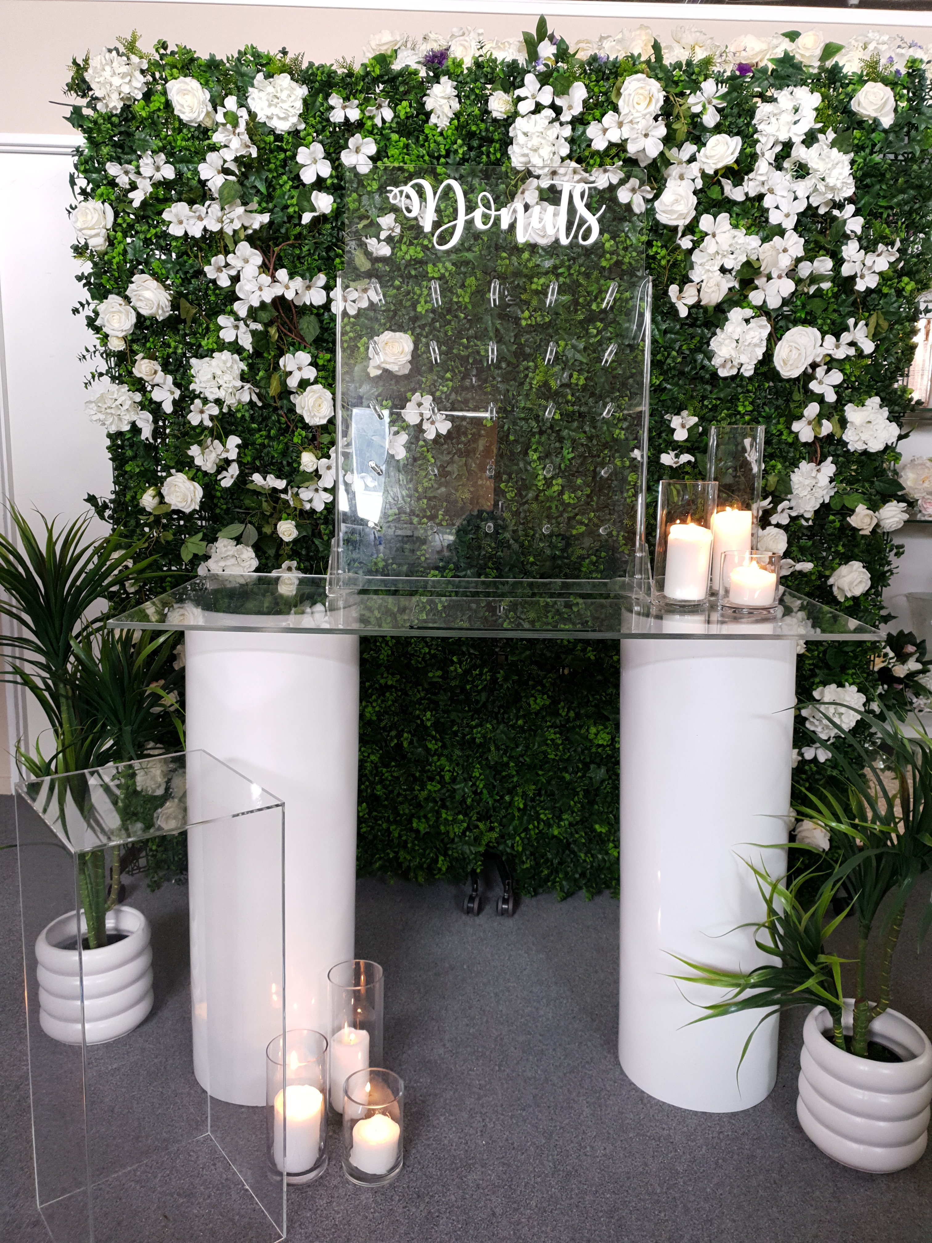- Acrylic table top, donut wall, acrylic cake stand on white plinths with ferns in white pots.