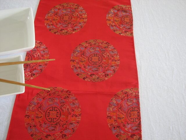 Beautiful red satin table runner embroidered with symbols of love and good fortune. An inspiration for your asian inspired wedding theme.   35cm x 300cm 50 available