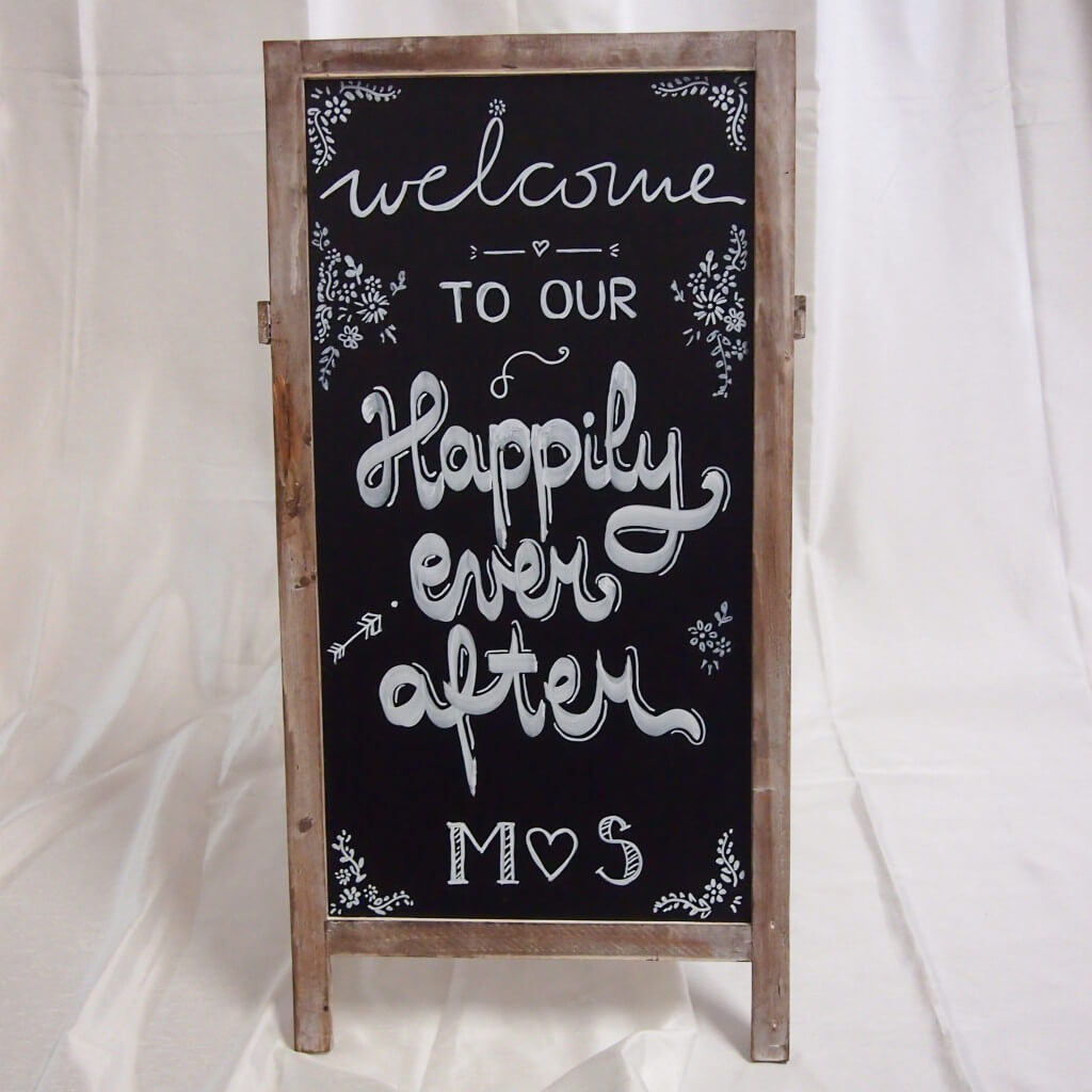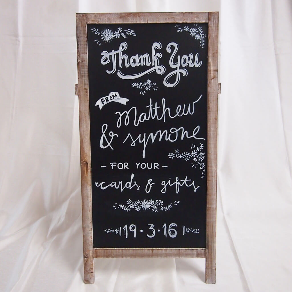 Chalkboard Frame Medium Chalkboard Frame Medium size ideal for welcoming your wedding guests, list of proceeding, directional boards. Rustic with stand attached which is ideal for placing on a table or directly on the ground. Frame measures 40cm x 80cm Ask us about our Chalk Art Signs – we are happy to write the signs…