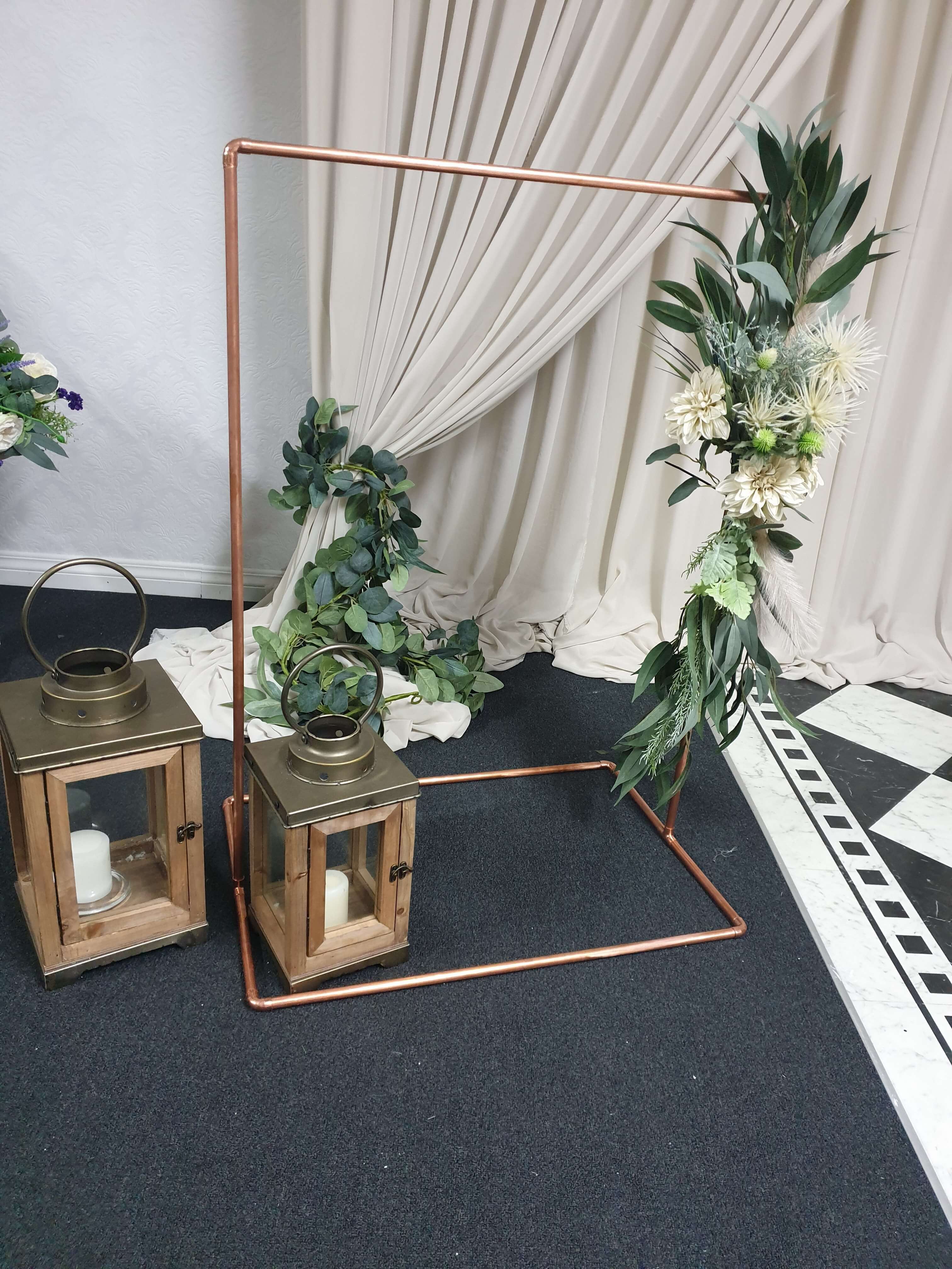 The size of this copper sign holder is 1m high by 70cm wide. Just add your personalised signage to welcome your wedding guests, display a seating plan, wish a special someone a happy birthday. Copper sign holder has been created to compliment our copper pipe arch