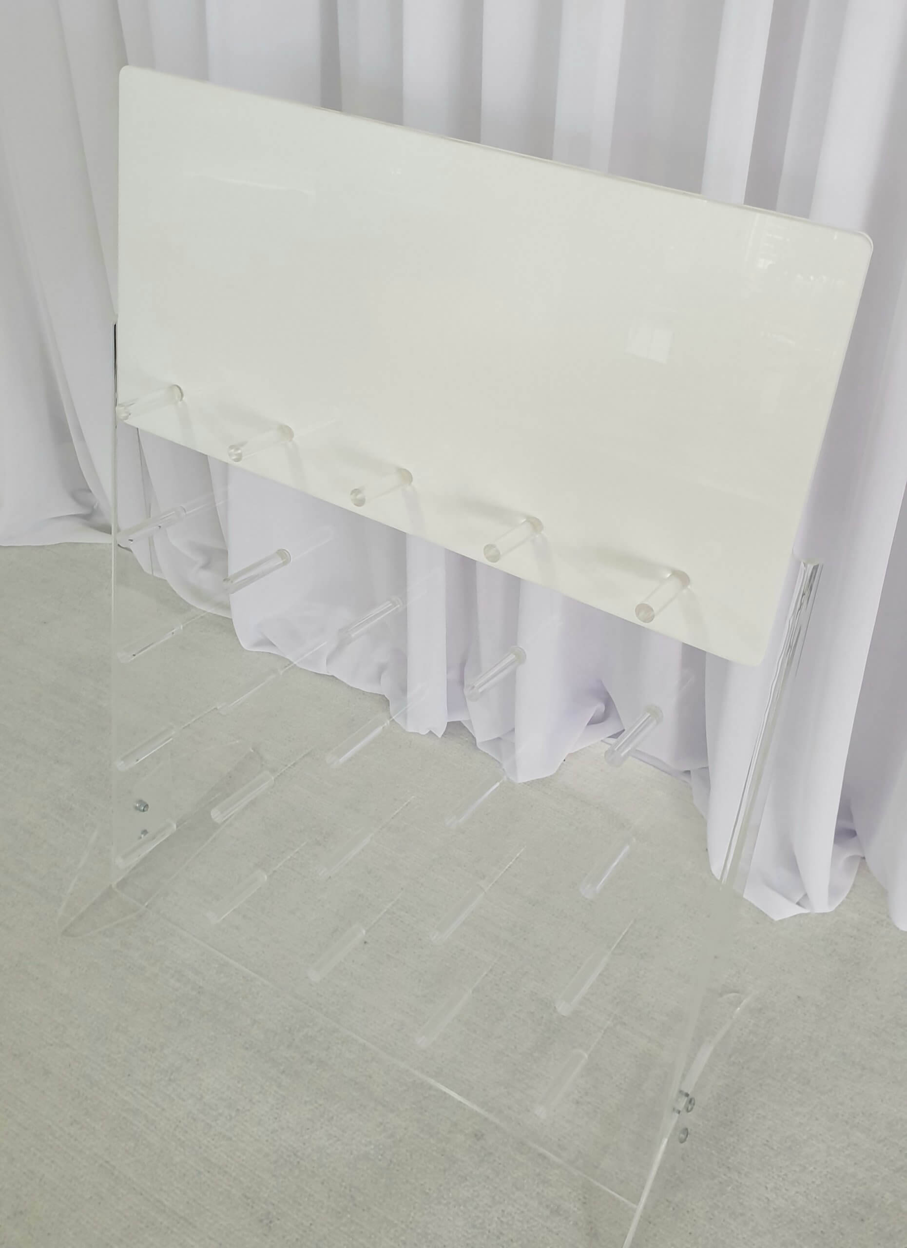 Donut wall made from acrylic is freestanding and holds 25 or 50 donuts. A great wall to sit on your dessert table loaded with delicious donuts. This acrylic donut wall measures 60cm x 80cm and comes with a white acrylic top panel for vinyl decals.   Have your own decals  made to suit you theme. Donuts not included.