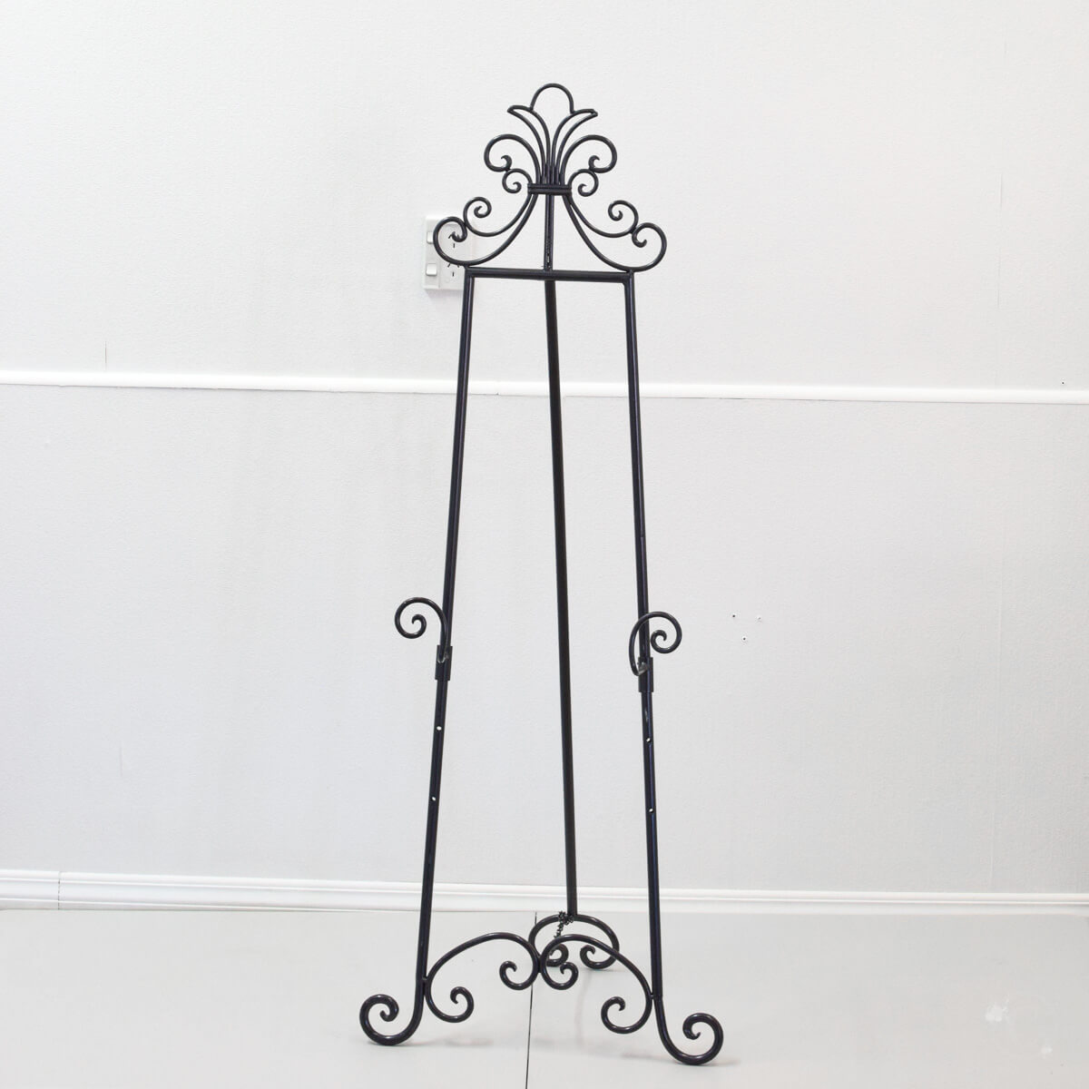 Easel floor standing “Jordan”  has adjustable arms. There are 2 of these black coloured metal easels available.  They are ideal for wedding seating plans, photo or artwork displays, event welcome signs.