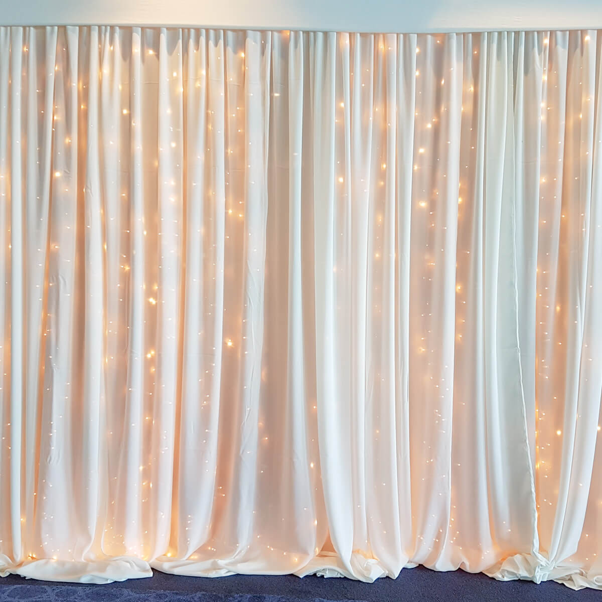 Fairly Light Curtain – 3m set width available to hire. This fairylight curtain can be hired out and self set up by you. The perfect way to add a bit of shine to your wedding bridal table or to brighten up your event. We have a 6m wide by 3m high fairylight backdrop available in our self set up range.This price includes all your essentials for a 3 metre fairylight backdrop.