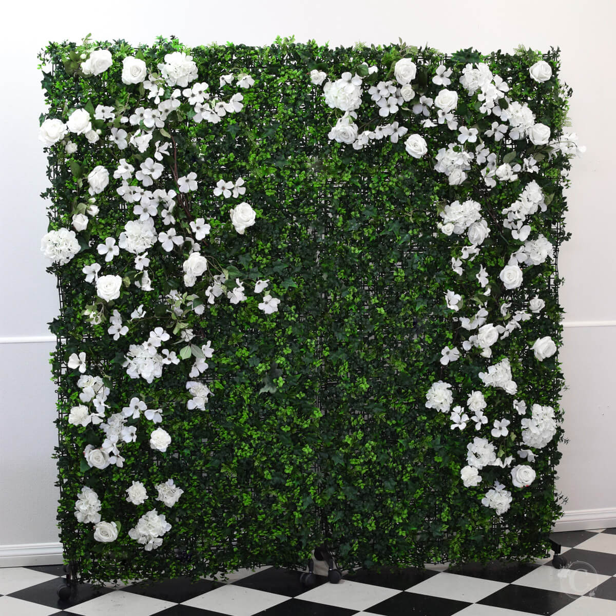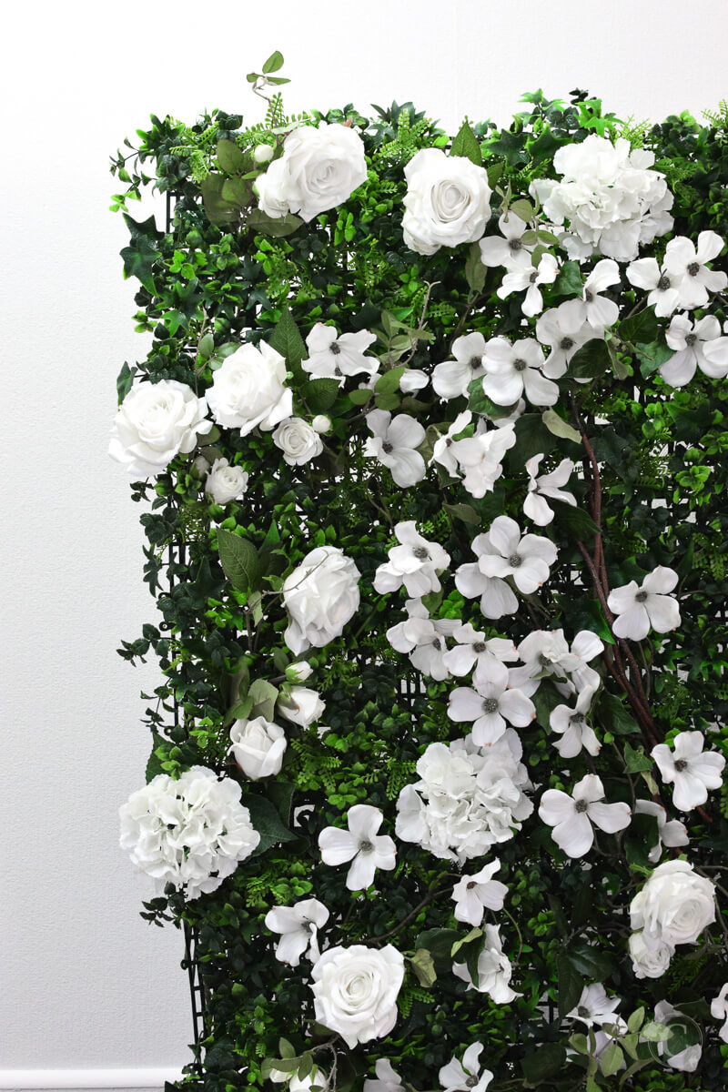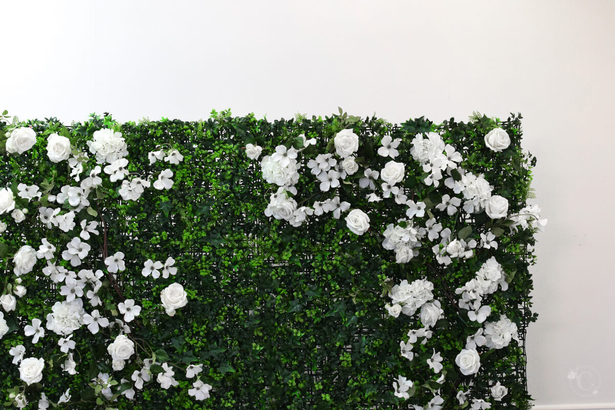 Green Wall 2 x 2 with white flowers. Self supporting, on frame and wheels for easy installation.