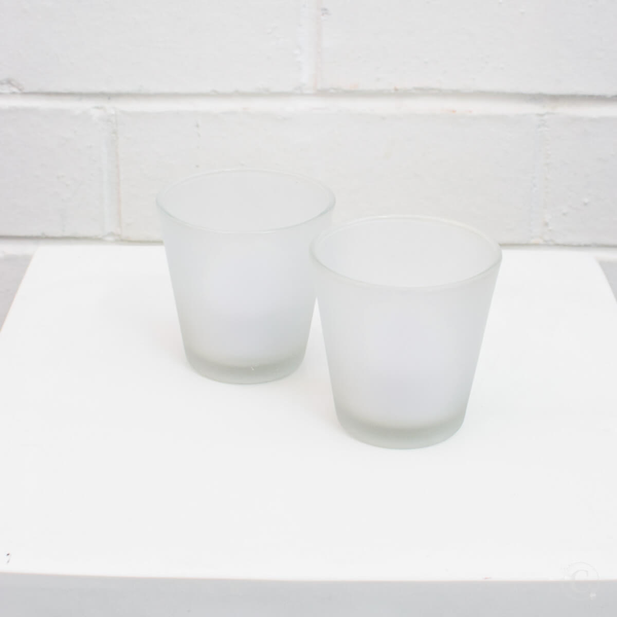 Frosted Tealight Holder Frosted tealight holder available with real wax candle or LED candle. Candles are an optional extra. There are 120 of these available to hire. Frosted candle holders soften the candle flame. Modern and classic, vintage and rustic styles are enhanced by these frosted tealight holder.