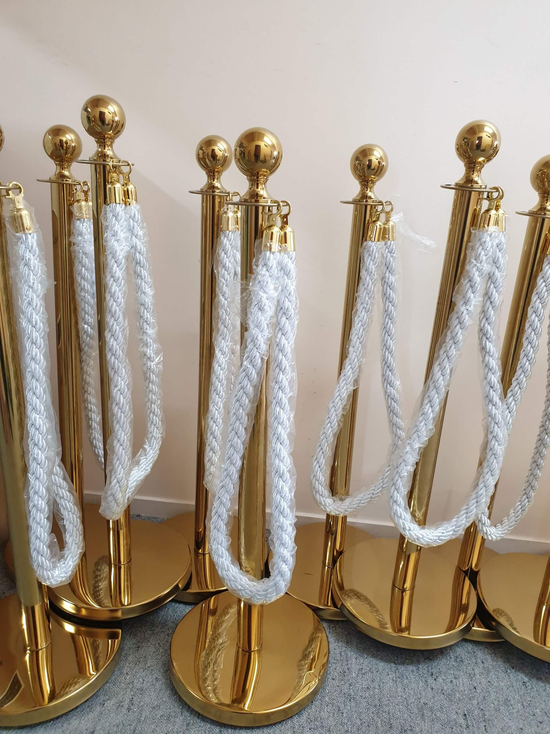 Gold Crowd Control Bollards with polished stainless steel ball top. 18 available.  Heavy base and pole in polished stainless steel – gold look. We have various coloured cords with gold hooks to attach to the stanchion as optional extra.   There is a   additional charge for the cords and you only need to hire the number required. Hire is per bollard/stand.  Cords are $4.00 +gst each Cords currently available in Black silky cord,  Red silky cord, white silky cord and Gold silky cord all with gold hooks.