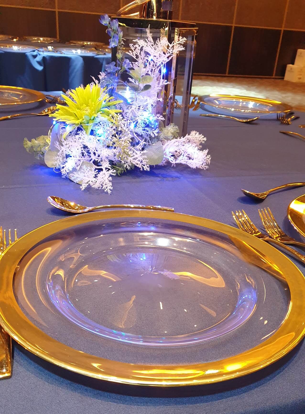 Clear Glass with gold rim.