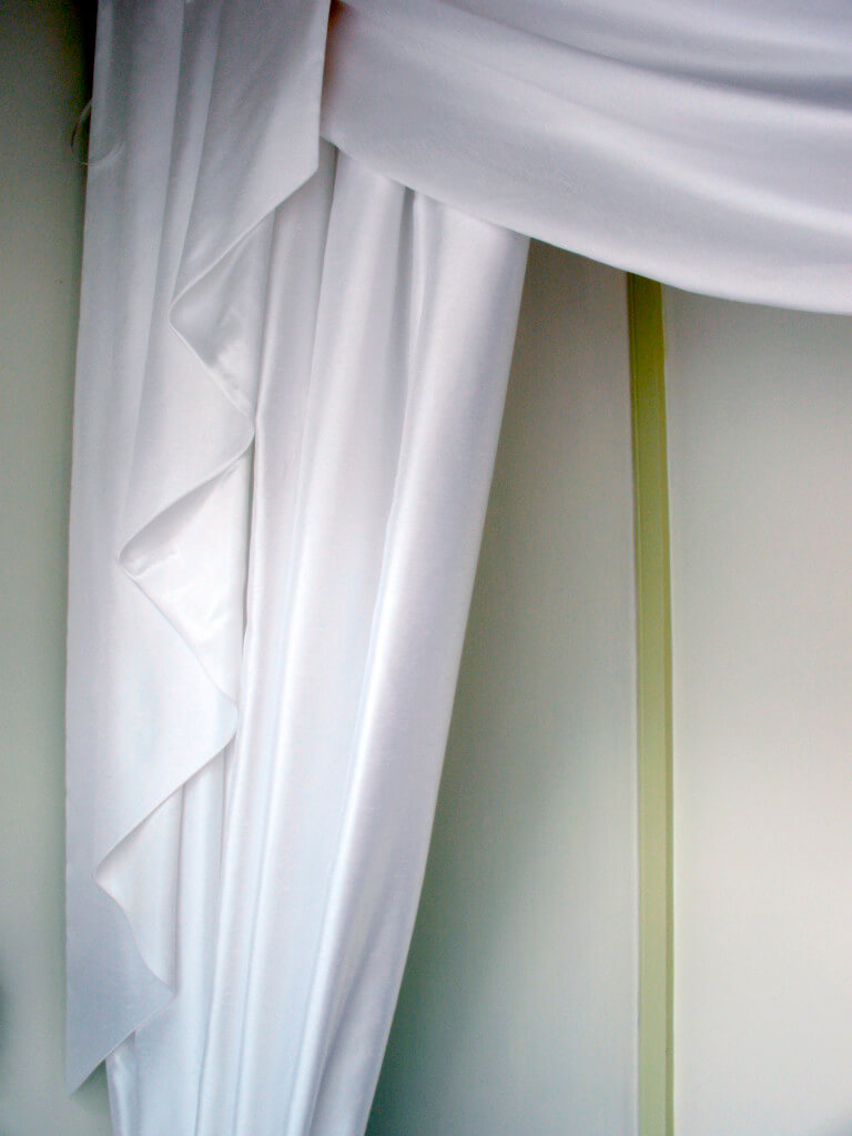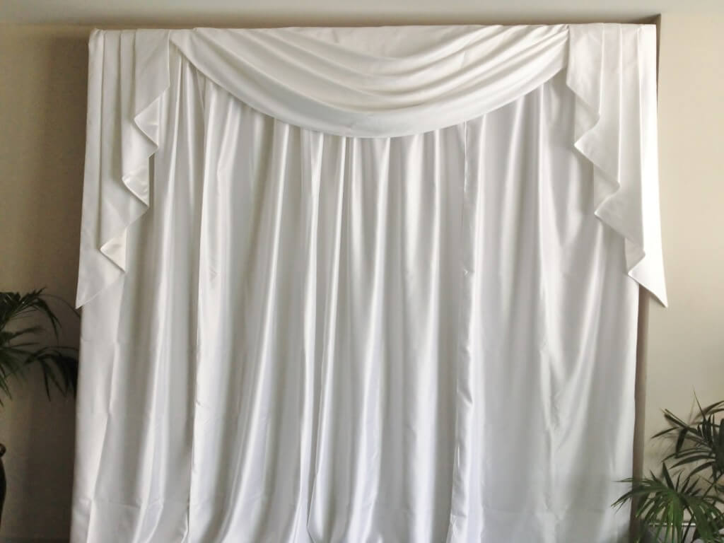 Luxury Drape Backdrop Luxury Drape Backdrop using Quality Sateen White Drapes 2.5m wide to 5m wide. Perfect if you’re looking to hide an unsightly wall or create a lovely backdrop without the fairy lights. Price includes poles & standard drapes. Additional price for the swagging (across the top) as pictured in the photo.