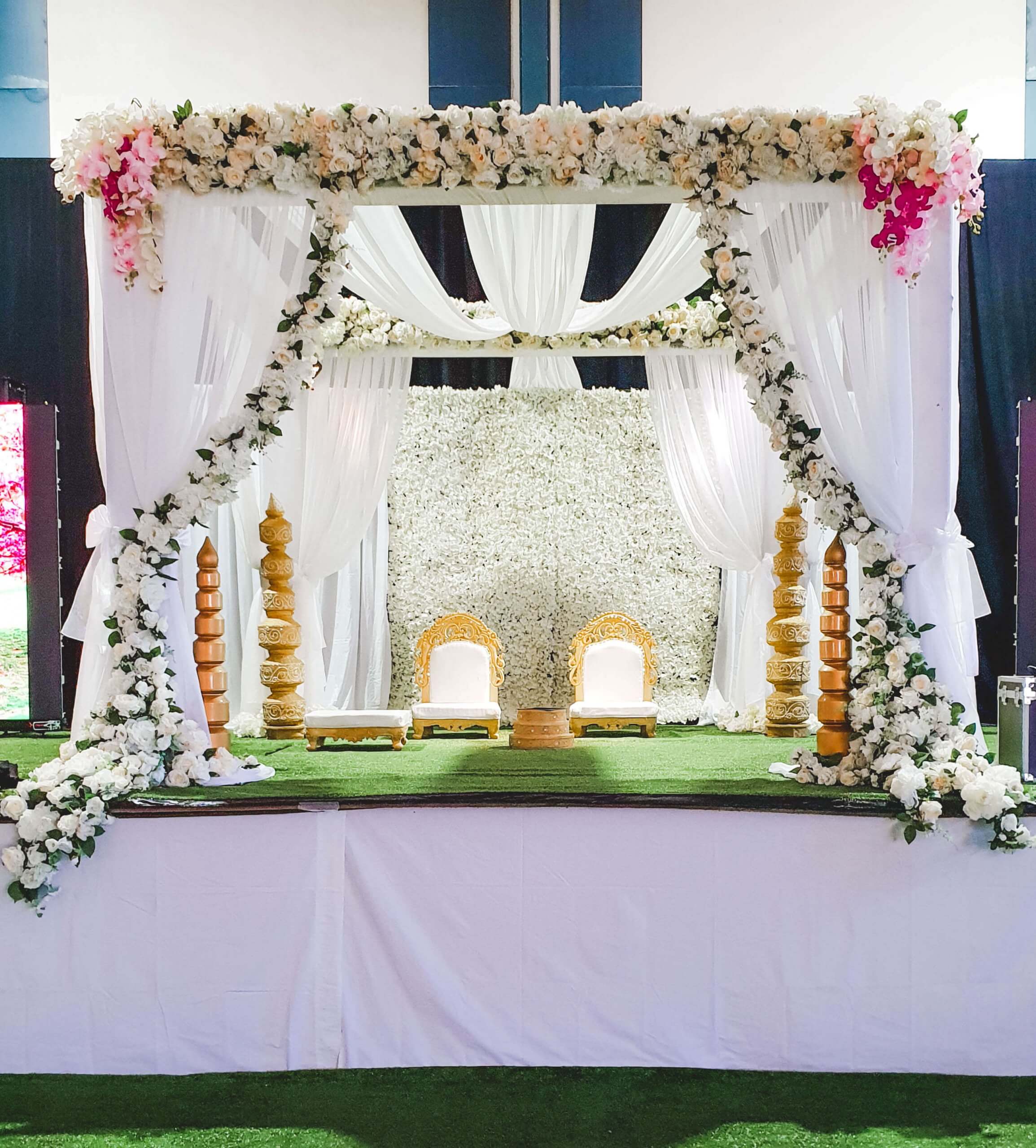Mandap Arti is a perfect show stopper. Your Indian Wedding stage will have your guests gasping in amazement.  When you ask us to create this beauty for you it will include the structure with canopy, fabric in various coloured fabrics,  two headers of flowers, 2 flower garland swags draped to the floor and additional florals for tie backs in the back corners. Set up and pack down is included in the package.  This ensures the mandap looks perfect on your special day. Includes a lovely floral backdrop which can be a flower wall or a lovely petal wall.  The flower backdrop if up to 3m wide.  You also have a colour choice for the fabric which includes but not limited to  white, cream, pink, taupe and more. If you are looking for something extra special for your wedding ceremony, talk to our dedicated team of designers about creating a personalised design. Please note furniture not included