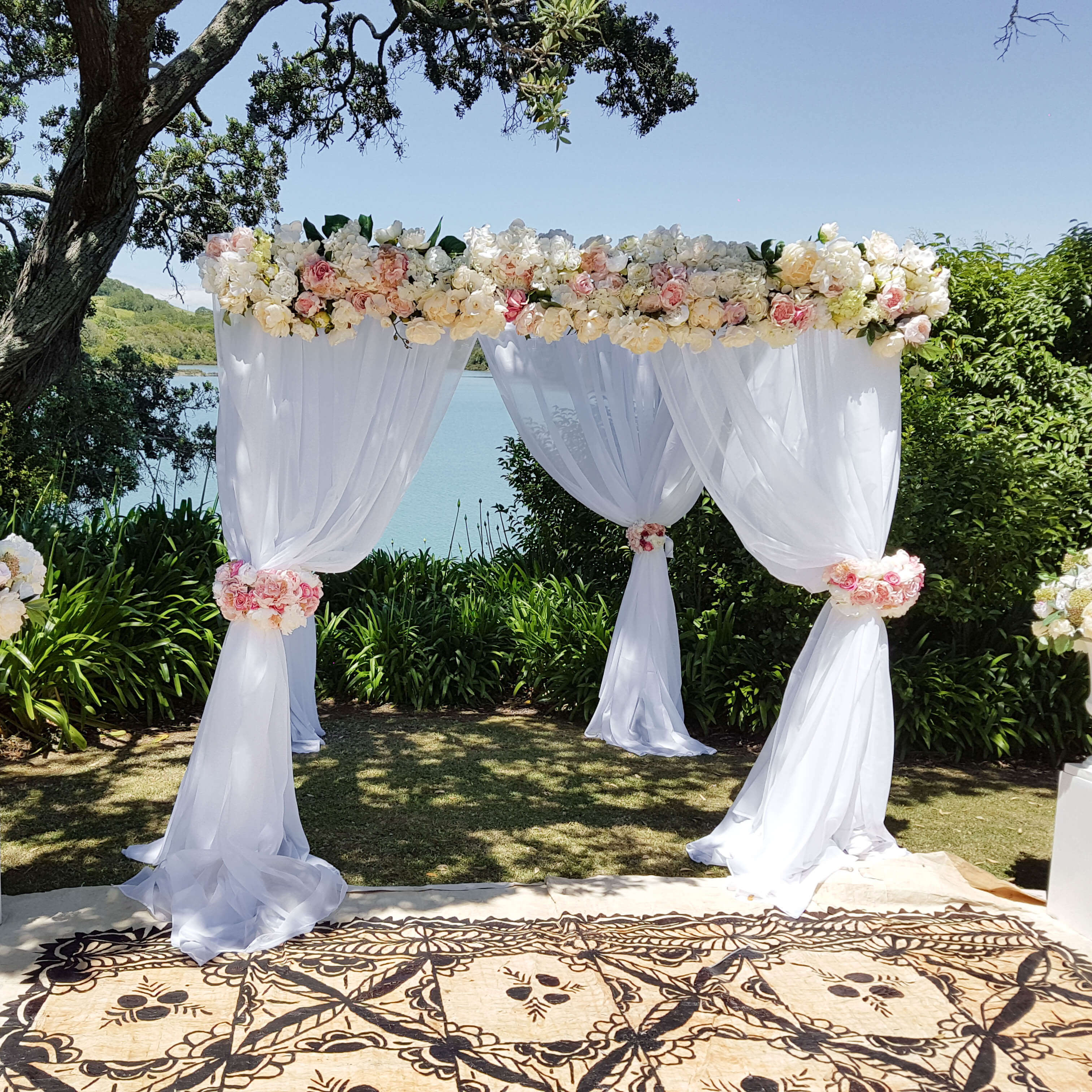 Mandap Priya rental includes the structure, fabric in various colour fabrics ( white, cream, pink, taupe and more) and one header of flowers and side tie back flowers. Set up and pack down are included however travel to your venue is extra. This ensures the arch looks stunning on your special day. OPTIONAL extras available upon request: Urns of flowers on pedestals. Additional florals. Fabric canopy, Floral Canopy, Floral garlands on fabric swags. If you are looking for something extra special for your wedding ceremony, talk to our dedicated team of designers about creating a personalized design.