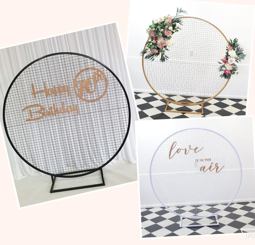 Mesh Circle Assorted Colors 1.9m backdrop. Create special memories with a mesh backdrop from our range. We have mesh circles in black, white and gold. Hang signs of your choice to create a fabulous background. Balloons, flowers and draping all looks amazing with a mesh circle which is 1.9m diameter. The mesh circles come apart across the middle of the circle and the stand unbolts for ease of transport. Very easy to assemble and reassemble these are a perfect DIY solution.   Please see other mesh backdrops available instore Examples of how this can be used here