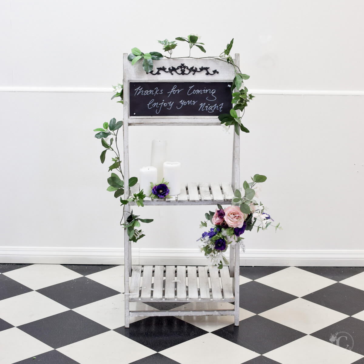 Rustic Wooden Shelves shabby chic effect. Small chalk board at top for your message of love, inspiration or instructions. Very popular for small bottles bubbles so your guests can celebrate your marriage vows. Place baskets of flower petals or paper cones filled with petals on the shelves so your guests can pick them up prior to…