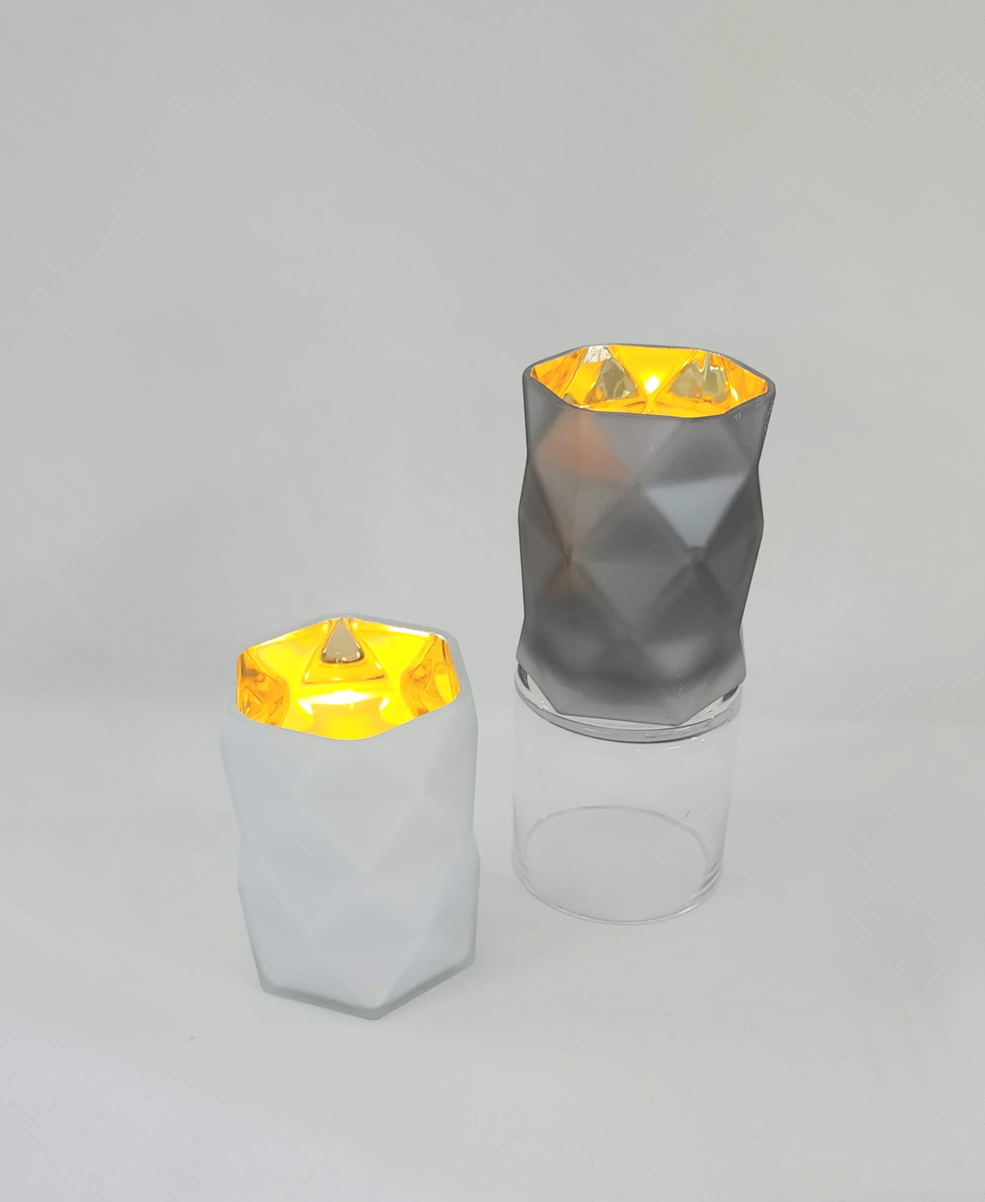 Echo Candleholder Pearl/Smoke for LED Candles ONLY Lovely geometric patterned smoke echo candleholder is a glass jar with gold internal colouring which reflects candle light creating a golden glow. Smoky grey coloured exterior with a metallic gold coated interior. 9.5cm x 13.5cm