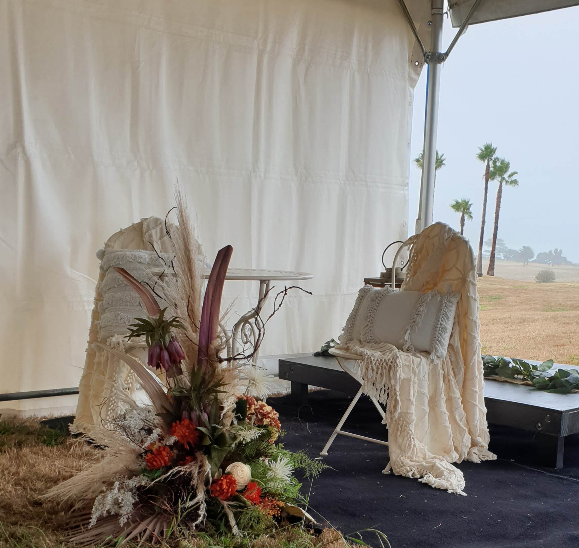 Toi toi & twig arrangement on plate that can be hired to enhance your wedding aisle, in front of a pedestal or as part of a final backdrop.