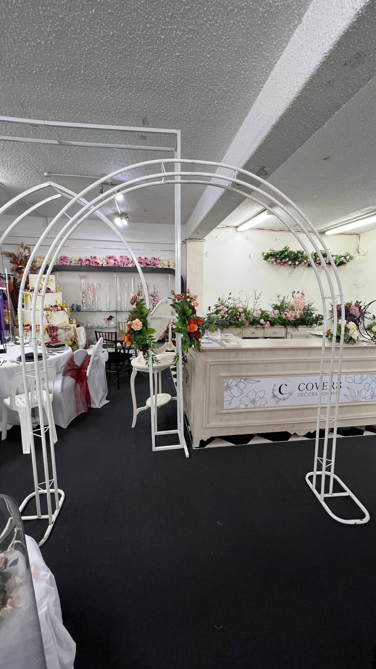 White Metal Arch suitable for weddings, parties and corporate events. Can be decorated with florals, balloons, greenery or lights.
