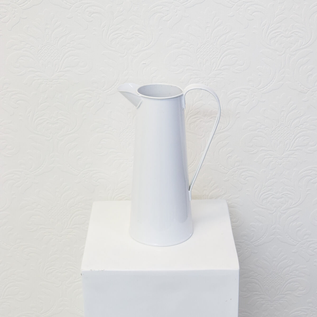 White Metal Jug for a rustic themed wedding setting. Dress this metal jug with cottage flowers